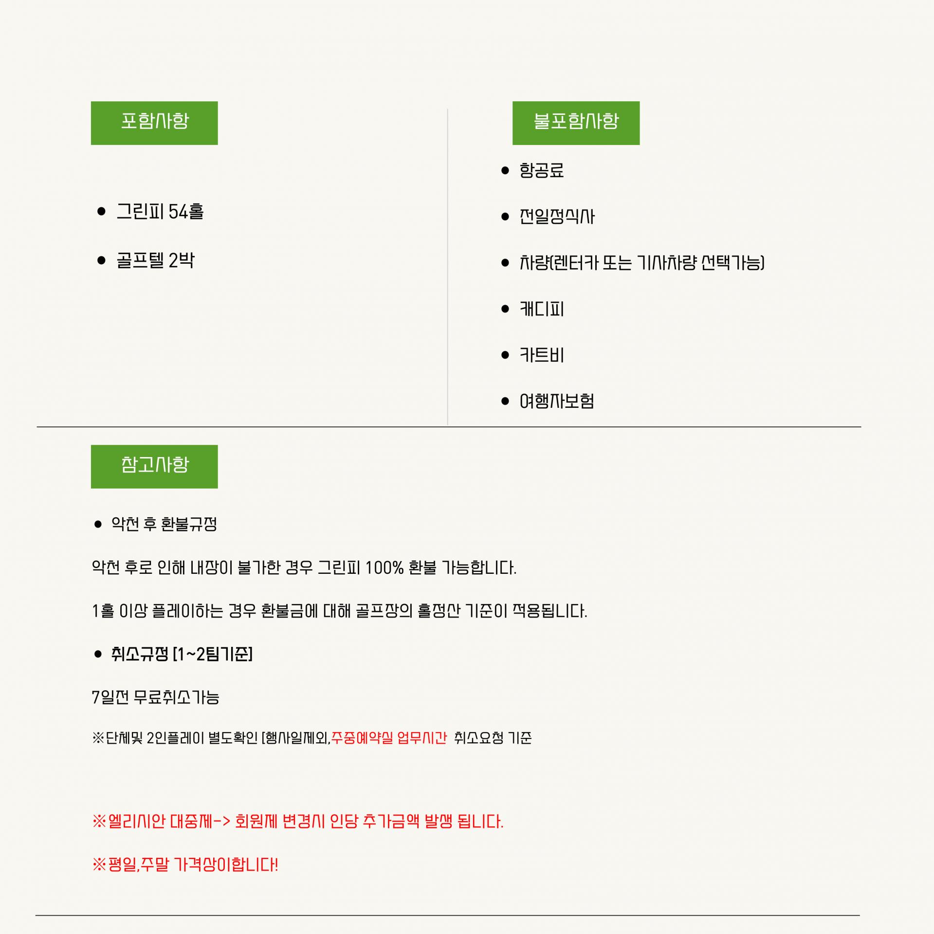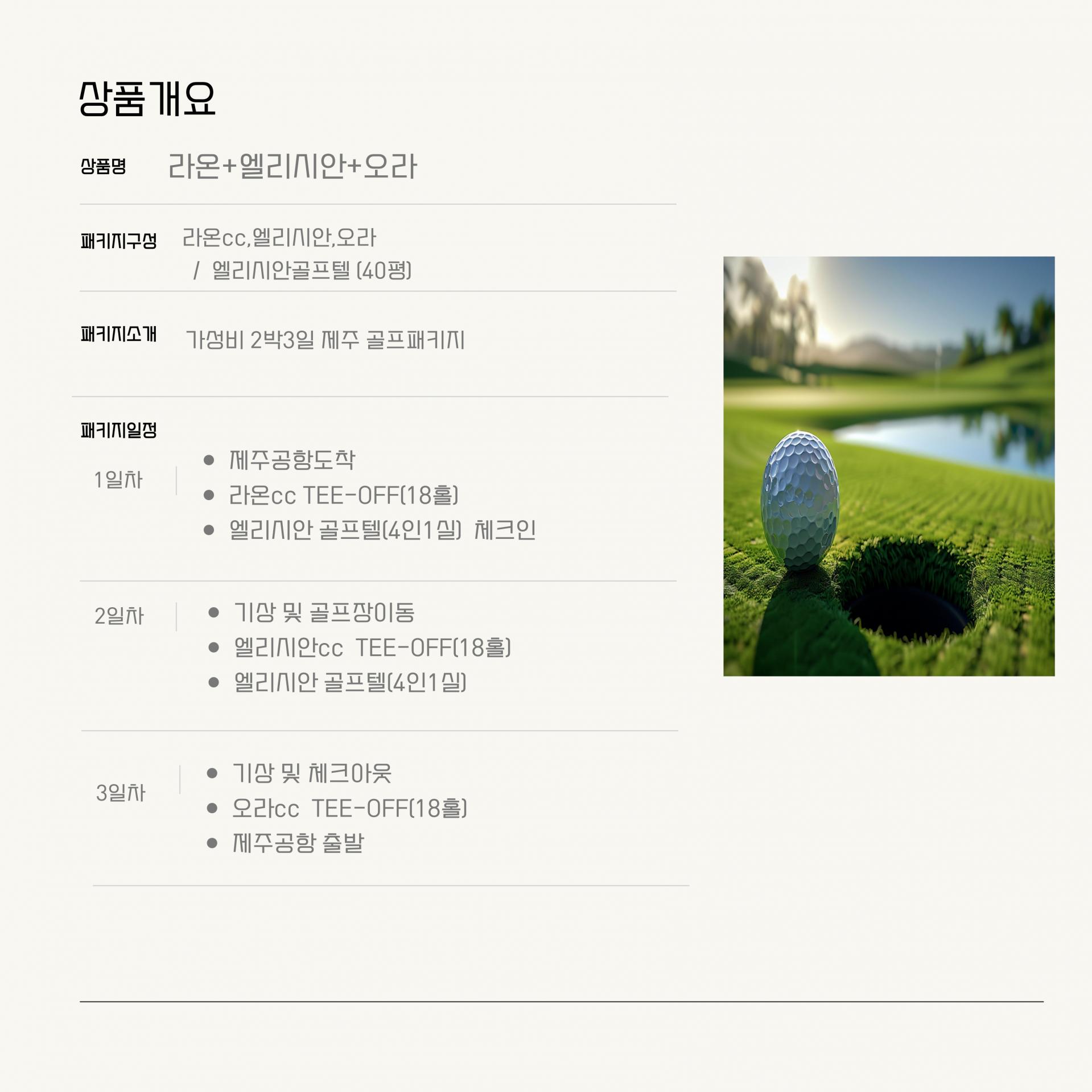 | 패키지 구성 | 라온CC, 엘리시안CC ,오라cc /엘리시안골프텔(40평) |